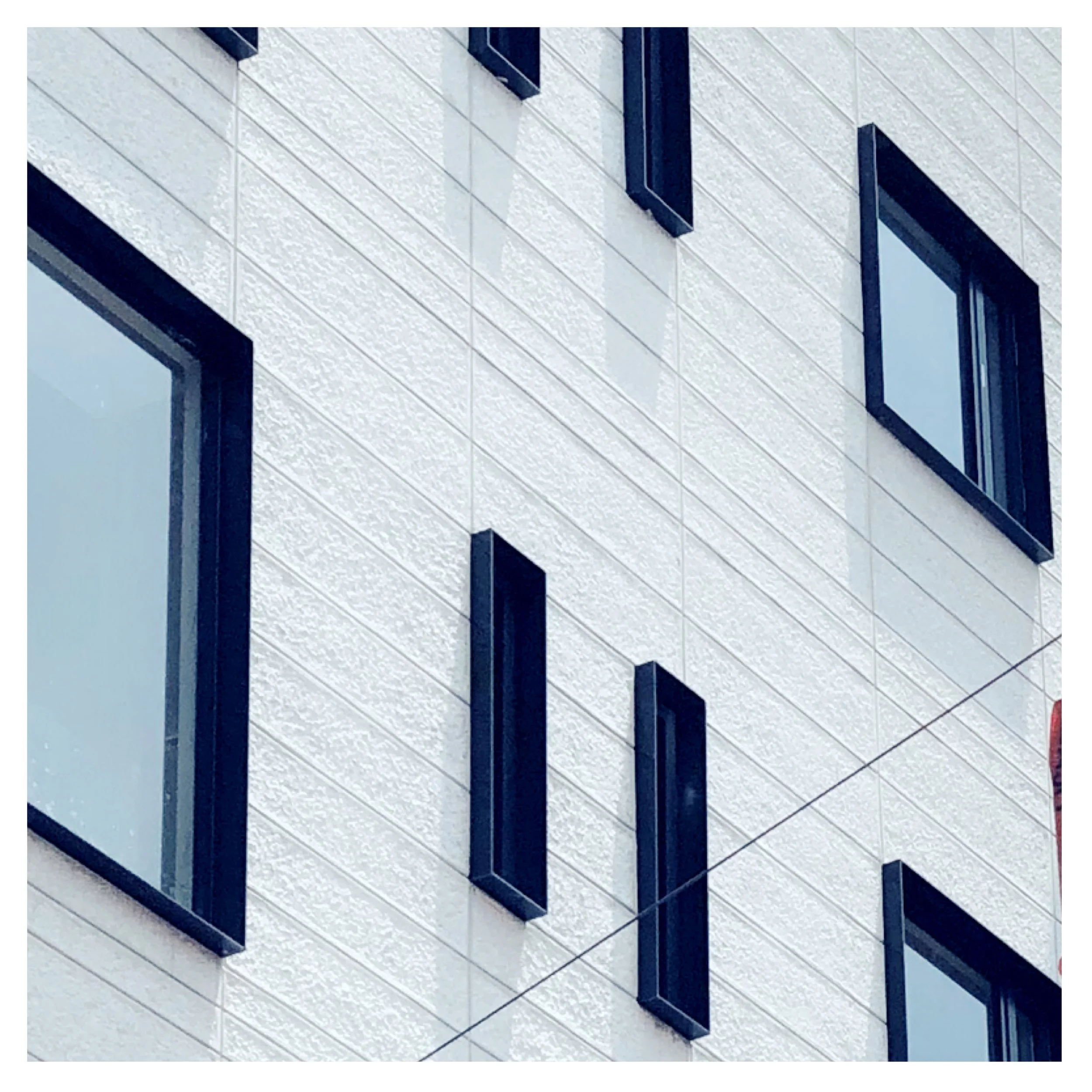 Vista de la fachada de un edificio con ventanas enmarcadas en negro y paredes de color beige con textura.
